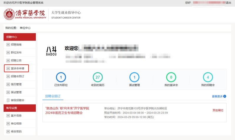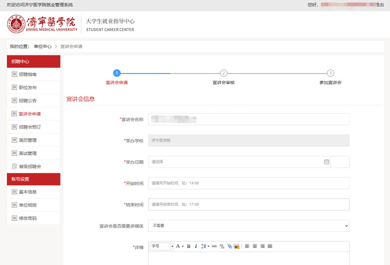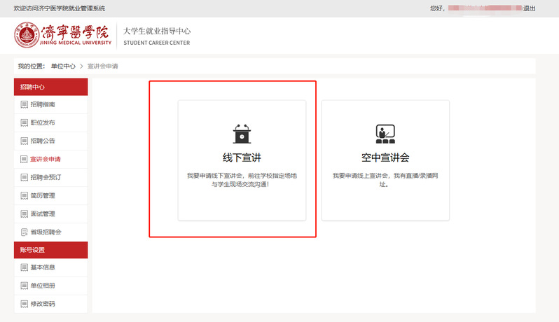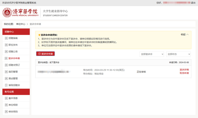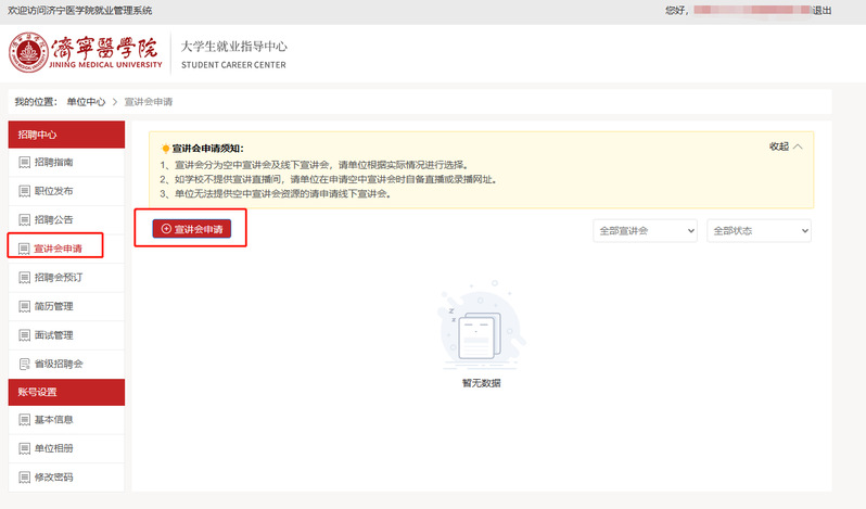 1.单位登录界面,左侧工具栏选择“宣讲会申请”