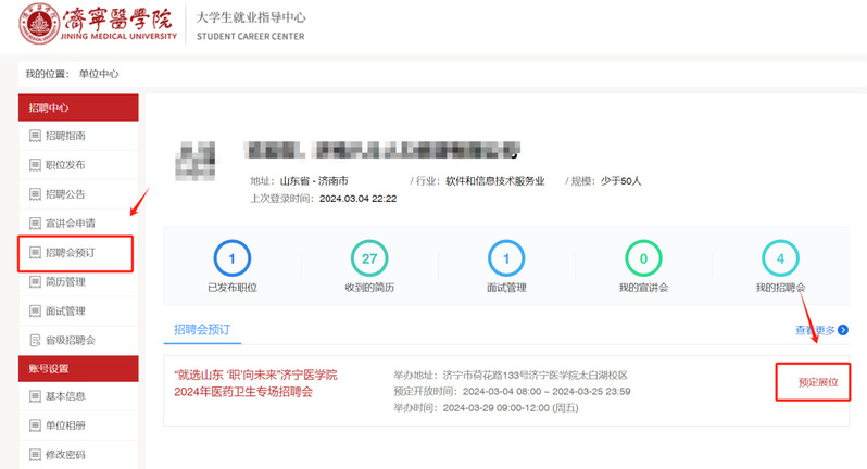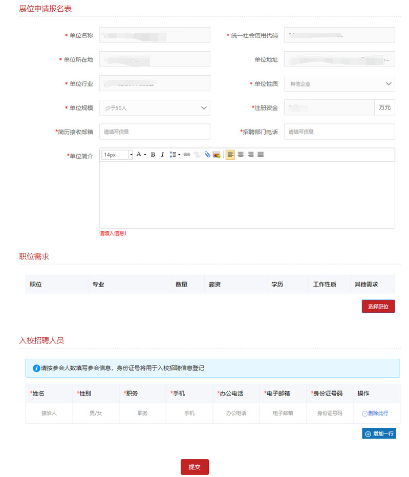 进入此次招聘会→选择【企业预定展位】→登录账号→【填写报名表】→【提交】
