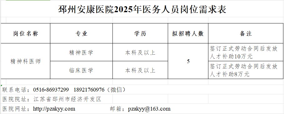 邳州安康医院(邳州市精神卫生中心),为二级甲等精神病专科医院,医疗保险定点机构,市精神、智力残疾评定定点机构,建筑面积1.32万平方米,开放床位350张,现有员工200人。