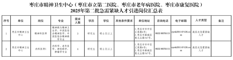 附件1:枣庄市精神卫生中心2025年第二批引进急需紧缺人才需求信息表